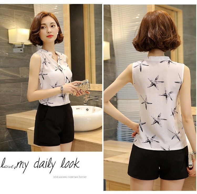 女式时尚无袖碎花雪纺衬衫女夏季大码衬衫印花上衣