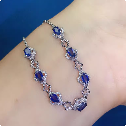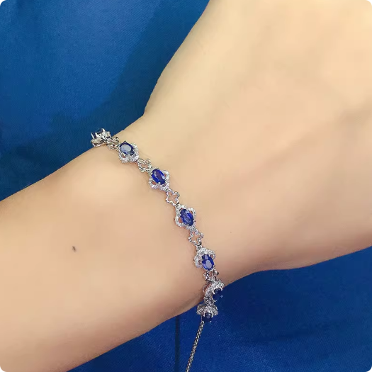 蓝宝石手链18K金镶嵌皇家蓝白金色四叶草钻石围镶款斯里兰卡手饰