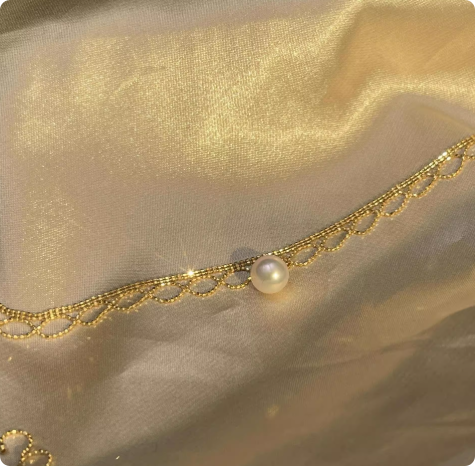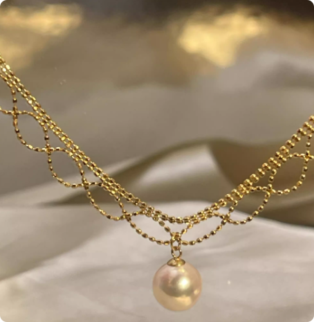 18k金黄金天然海水正圆强光akoya珍珠吊坠素金蕾丝项链锁骨链颈饰