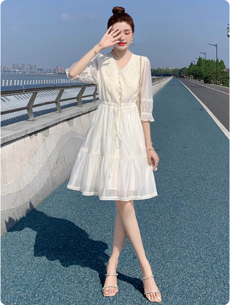 新款法式高级感V领刺绣仙女裙温柔风收腰白色连衣裙女潮